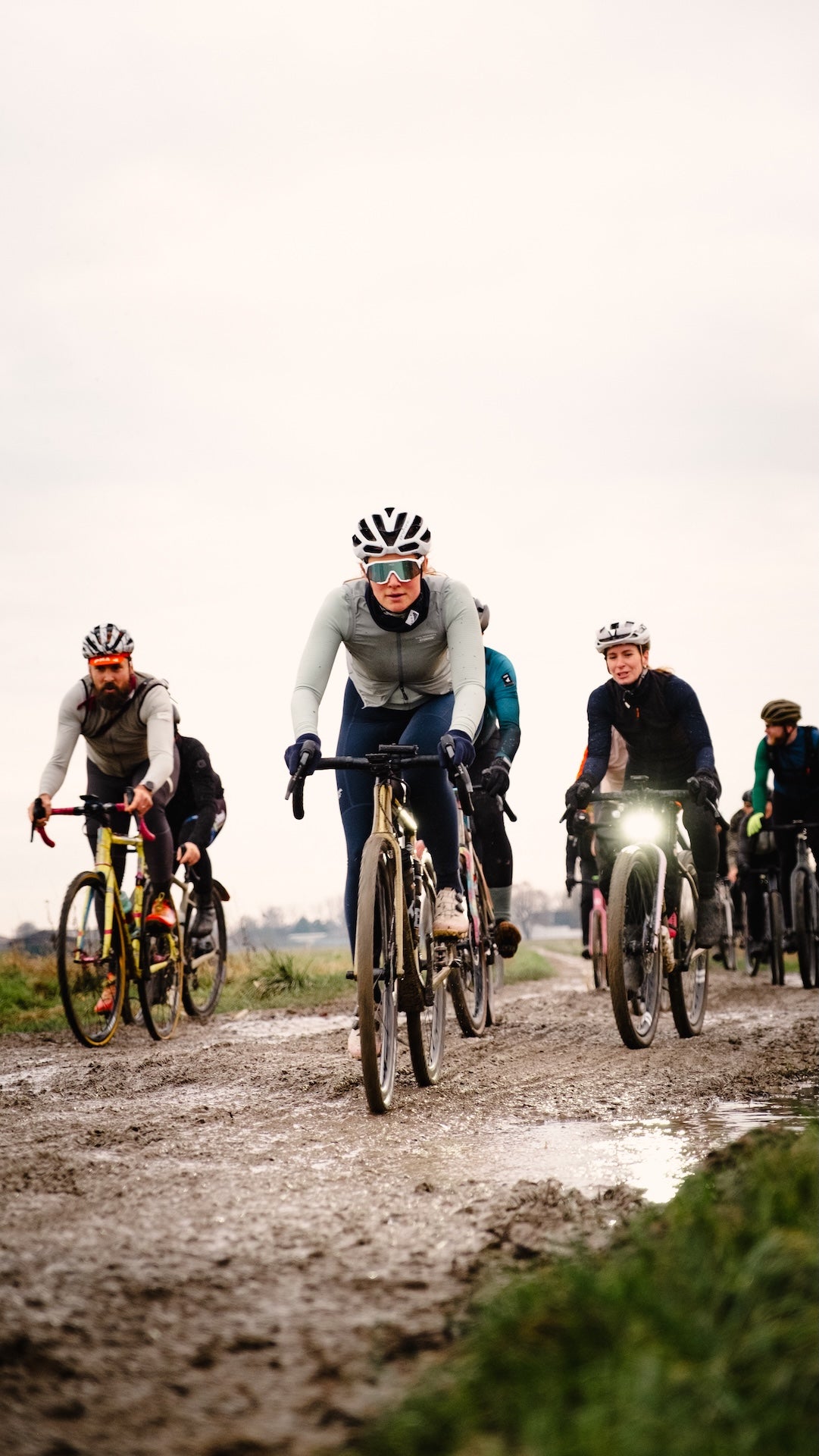 Mud came quickly, as expected. Bikes coated, hubs dirty but fully sealed, spirits high. The sun broke through as the group rolled on, winter light warming faces and loosening legs.