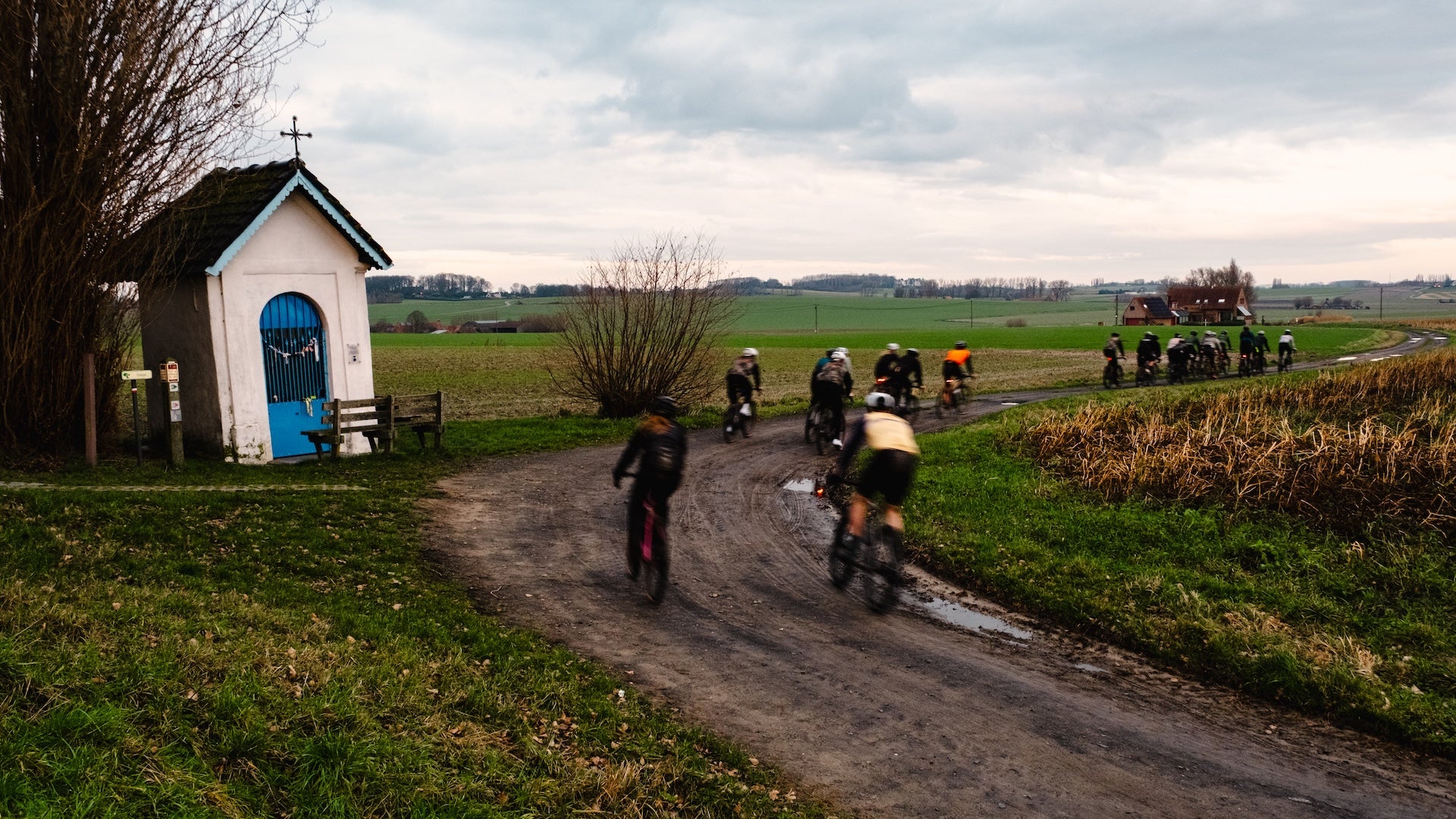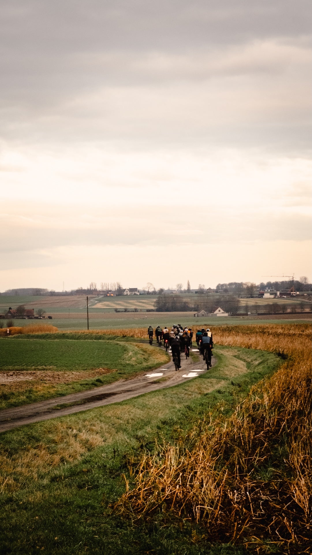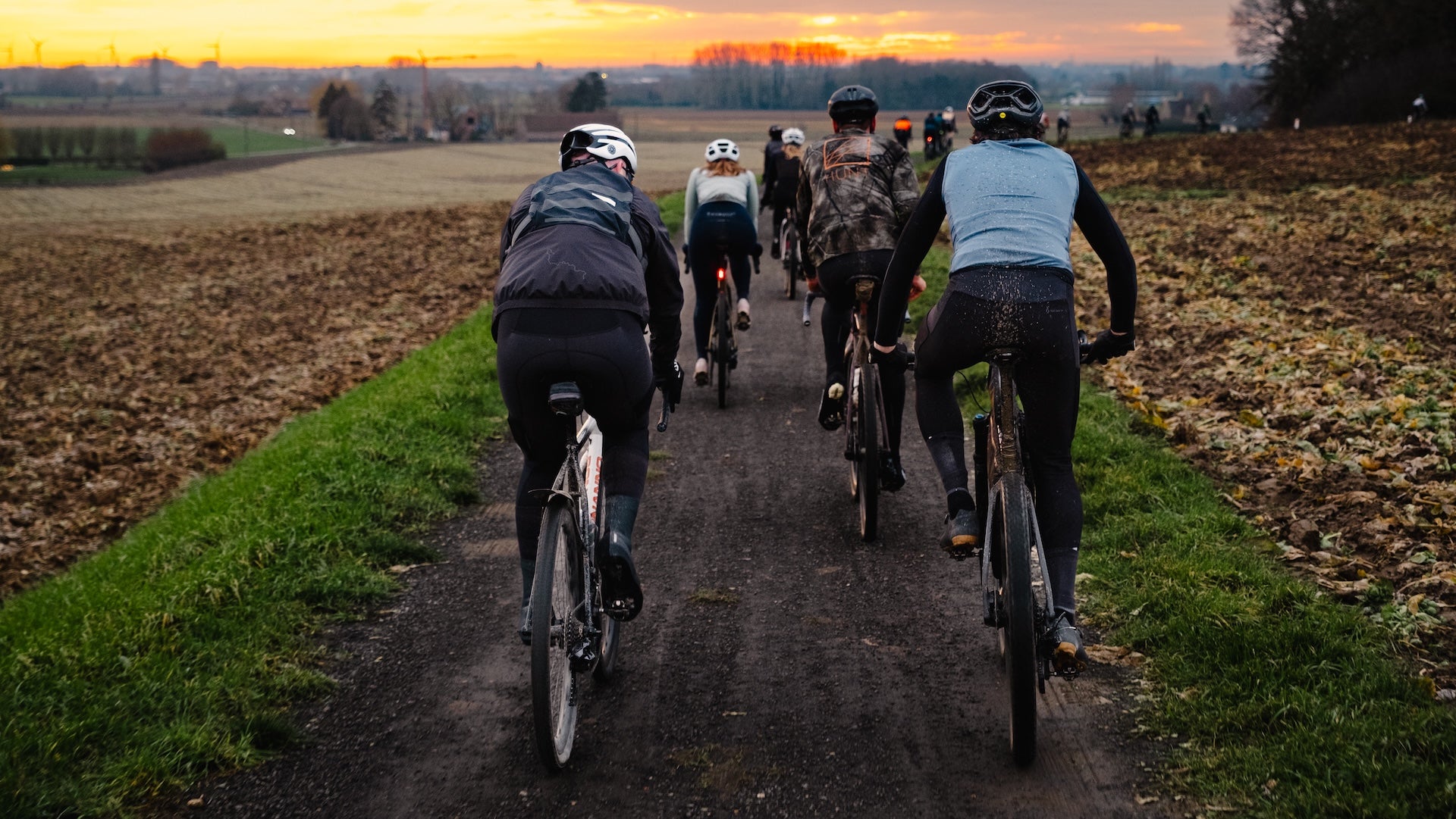 As sunset accompanied the ride back to Kortrijk, the pace eased naturally. Tired legs, muddy bikes, clear heads. Back where it started, with warmth, coffee, and the quiet satisfaction of a winter ride done right. Good people, good bikes, and a reminder of why we ride: even in January.